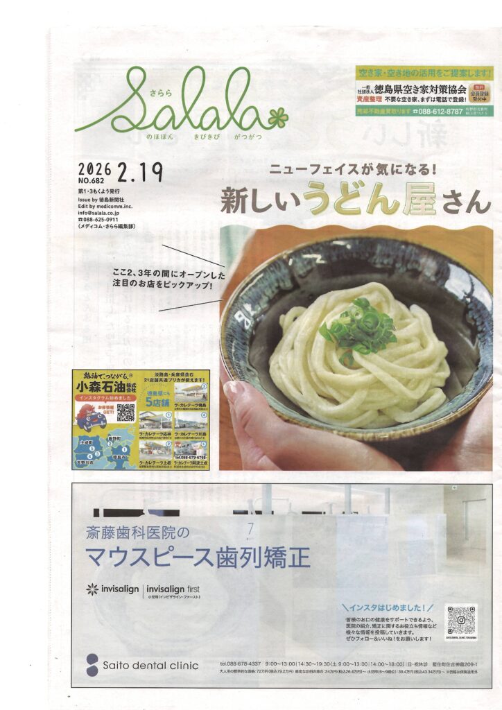 徳島新聞 さらら 2026/2/19 に掲載されました 2/19日徳島新聞さららに掲載させていただきました。 「見えにくい矯正」を「見える安心」で。 矯正相談も随時行っておりますのでご予約お待ち致しております。 Posted on 2026年2月19日